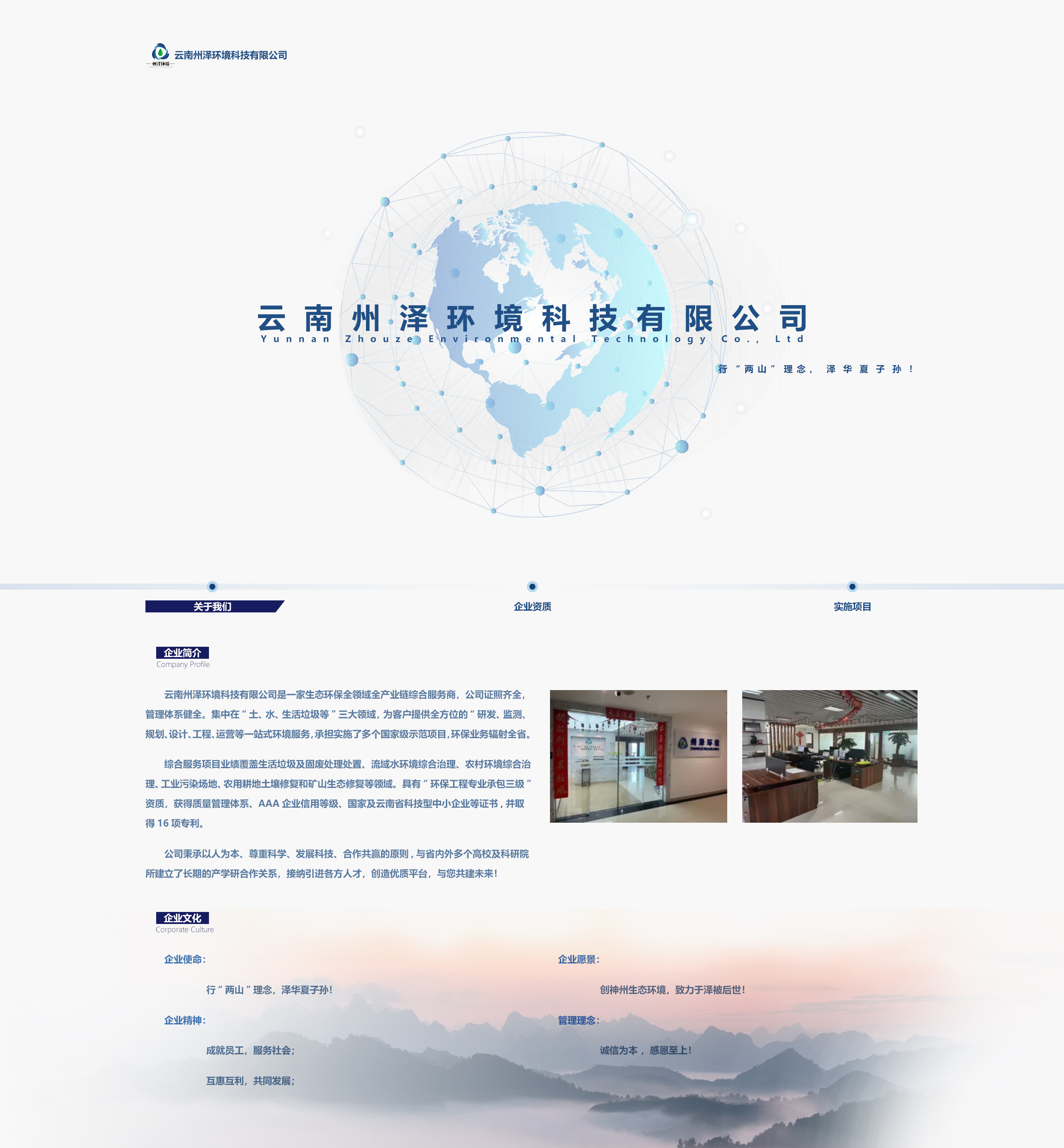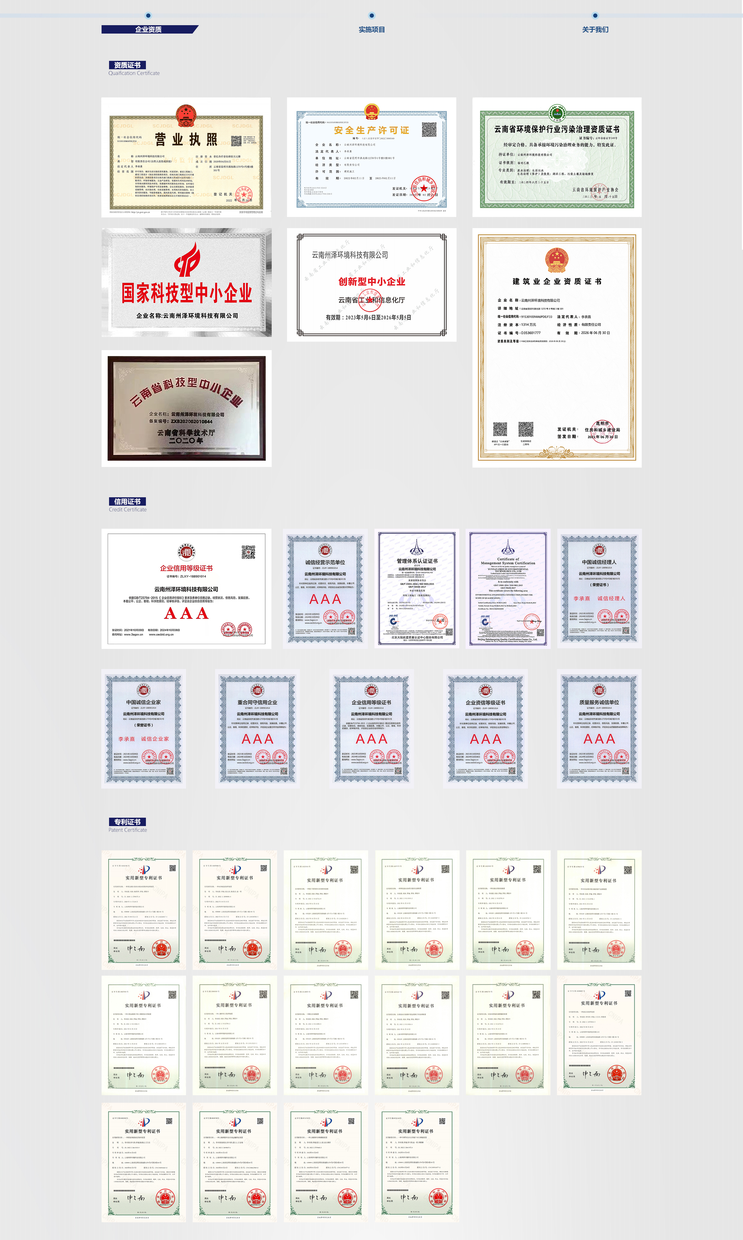 綜合服務(wù)項(xiàng)目業(yè)績(jī)覆蓋生活垃圾及固廢處理處置、流域水環(huán)境綜合治理、農(nóng)村環(huán)境綜合治理、工業(yè)污染場(chǎng)地、農(nóng)用耕地土壤修復(fù)和礦山生態(tài)修復(fù)等領(lǐng)域。具有“環(huán)保工程專業(yè)承包三級(jí)”資質(zhì),獲得質(zhì)量管理體系、AAA企業(yè)信用等級(jí)、國(guó)家及云南省科技型中小企業(yè)等證書(shū),并取得16項(xiàng)專利。